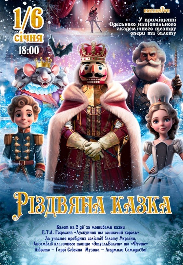 Балет "Щелкунчик. Рождественская сказка" состоится 6 января 2026, 18:00, вторник в Одесский национальный академический театр оперы и балета. С помощью сервиса internet-bilet.ua, Вы сможете с легкостью забронировать, заказать и купить билеты на интересующий Вас концерт, спектакль, оперу, балет, мастер-классы, спортивные и детские мероприятия, оплатив их самым удобным для Вас способом: через интернет банковской картой VISA/MasterCard, наличными или курьером, если сделаете заказ билета c доставкой.