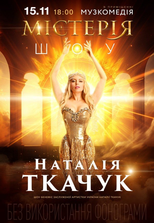 Приглашаем вас на шоу-бенефис Заслуженной артистки Украины Натальи Ткачук! Шоу Мистерия увлекает мировыми хитами в современной аранжировке, звучащими в сопровождении симфонического оркестра, создавая незабываемое зрелище.