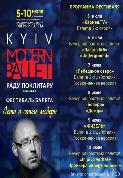 Фестиваль Киев Модерн Балет. "In pivo veritas", "Вверх по реке" відбудеться 10 липня 2017, 19:00, понеділок в Одеський національний академічний театр опери та балету. За допомогою сервісу internet-bilet.ua, Ви зможете з легкістю забронювати, замовити та купити квитки на концерт, спектакль, оперу, балет, майстер-класи, спортивні та дитячі заходи, що Вас цікавлять, оплативши їх найбільш зручним для Вас способом: через інтернет банківською карткою VISA/MasterCard, готівкою або кур'єром, якщо зробите замовлення квитка з доставкою.