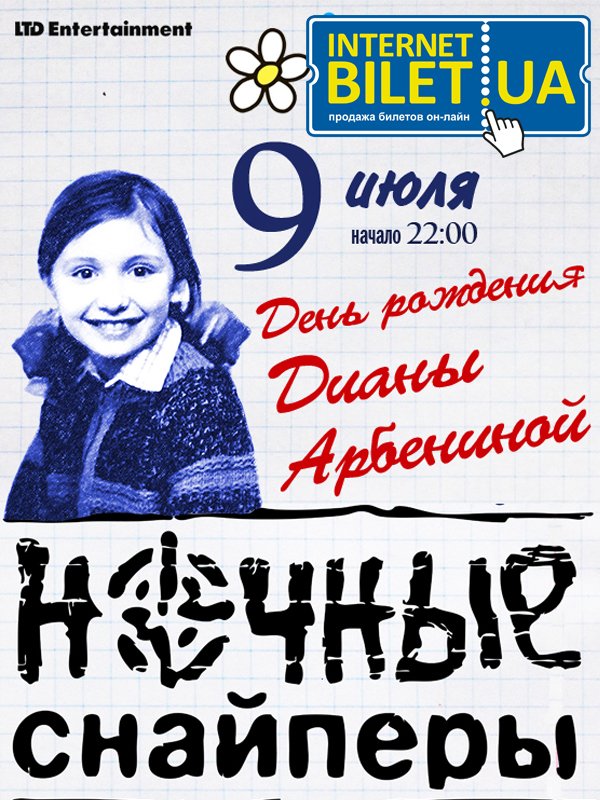 Ночные Снайперы. День рождения Дианы Арбениной. відбудеться 9 липня 2013, 22:00, вівторок в Клуб "Ibiza". За допомогою сервісу internet-bilet.ua, Ви зможете з легкістю забронювати, замовити та купити квитки на концерт, спектакль, оперу, балет, майстер-класи, спортивні та дитячі заходи, що Вас цікавлять, оплативши їх найбільш зручним для Вас способом: через інтернет банківською карткою VISA/MasterCard, готівкою або кур'єром, якщо зробите замовлення квитка з доставкою.