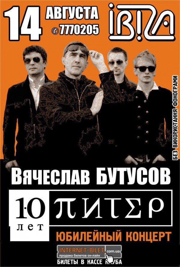 Вячеслав Бутусов и группа Ю-Питер відбудеться 14 серпня 2012, 19:00, вівторок в Клуб "Ibiza". За допомогою сервісу internet-bilet.ua, Ви зможете з легкістю забронювати, замовити та купити квитки на концерт, спектакль, оперу, балет, майстер-класи, спортивні та дитячі заходи, що Вас цікавлять, оплативши їх найбільш зручним для Вас способом: через інтернет банківською карткою VISA/MasterCard, готівкою або кур'єром, якщо зробите замовлення квитка з доставкою.