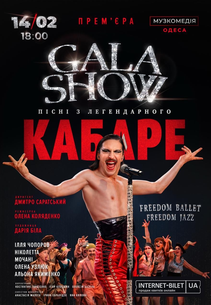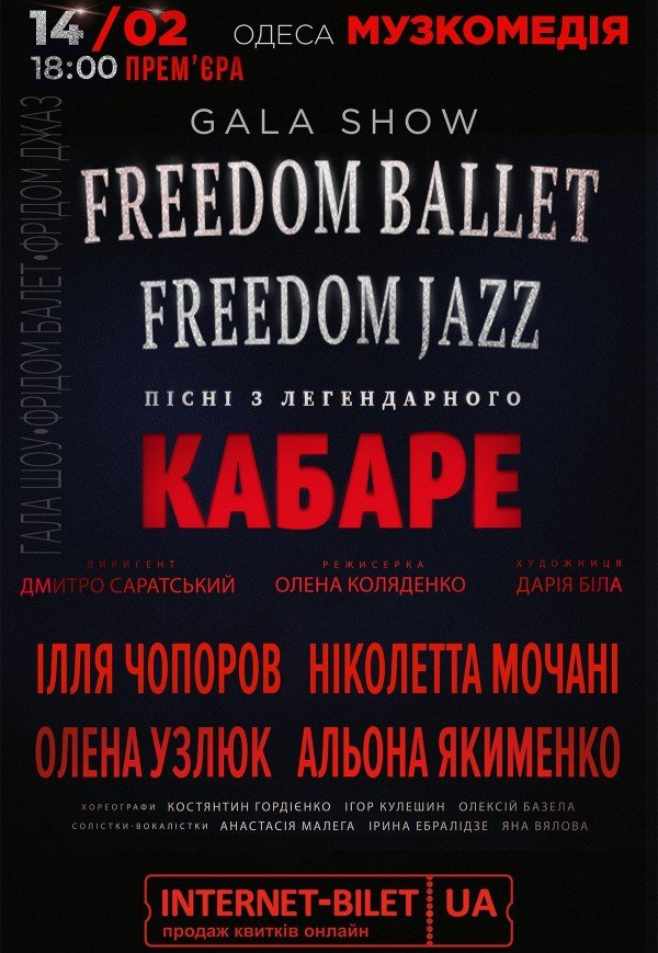 Freedom Ballet. Gala Show. Пісні з легендарного КАБАРЕ відбудеться 14 лютого 2026, 18:00, субота в Одеський театр музичної комедії. За допомогою сервісу internet-bilet.ua, Ви зможете з легкістю забронювати, замовити та купити квитки на концерт, спектакль, оперу, балет, майстер-класи, спортивні та дитячі заходи, що Вас цікавлять, оплативши їх найбільш зручним для Вас способом: через інтернет банківською карткою VISA/MasterCard, готівкою або кур'єром, якщо зробите замовлення квитка з доставкою.