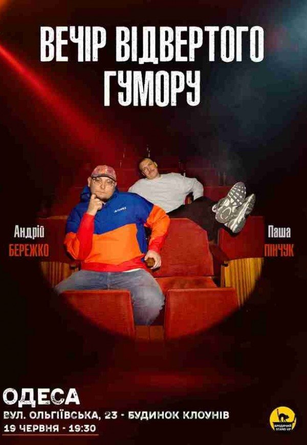 Вечір відвертого гумору Паші Пінчука та Андрія Бережка відбудеться 19 червня 2026, 19:30, п’ятниця в Театр "Маски" (Будинок Клоунів). За допомогою сервісу internet-bilet.ua, Ви зможете з легкістю забронювати, замовити та купити квитки на концерт, спектакль, оперу, балет, майстер-класи, спортивні та дитячі заходи, що Вас цікавлять, оплативши їх найбільш зручним для Вас способом: через інтернет банківською карткою VISA/MasterCard, готівкою або кур'єром, якщо зробите замовлення квитка з доставкою.